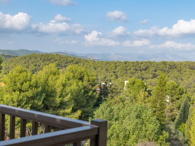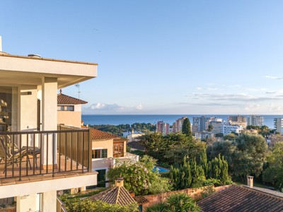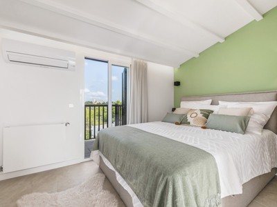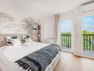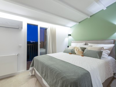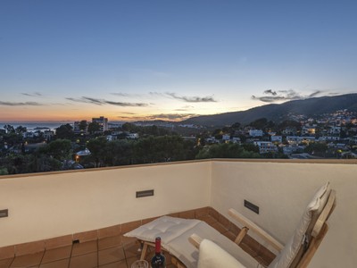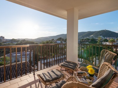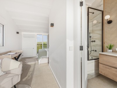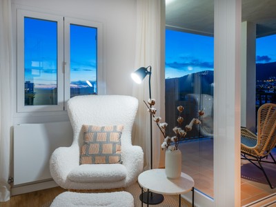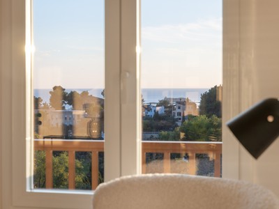 En la planta superior, el segundo dormitorio —amplio y privado— se corona con dos balcones propios. En total, cuatro balcones permiten elegir el momento del día: café con brisa, lectura al sol o una copa mientras el cielo se derrite sobre la bahía. Las vistas abrazan el mar, la naturaleza y el emblemático Castillo de Bellver.